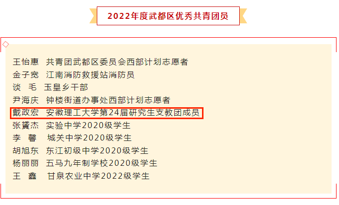 近日,甘肃省陇南市武都区“五四红旗团委(团支部)”“优秀共青团员”“优秀共青团干部”“优秀创业青年”“优秀青年志愿者”评选揭晓,我校第24届研究生支教团成员戴政宏荣获武都区“优秀共青团员”荣誉称号。